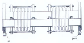 該膨脹節(jié)由兩段波紋管,中間接管及帶有限位螺母的小拉桿等零件組成,它在吸收橫向位移的同時(shí),還吸收軸向位移。