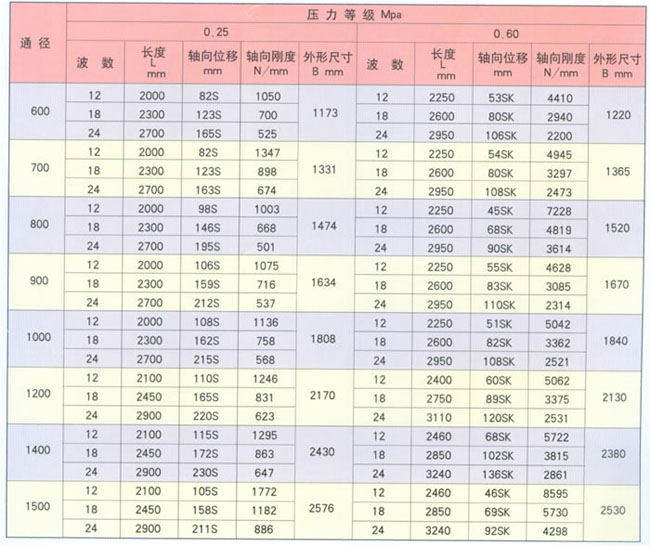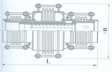 該膨脹節(jié)的二端各有一個工作波紋管,中間有一個平衡波紋管,膨脹節(jié)通過受力構(gòu)件(大拉桿或舌管)來承受內(nèi)壓推力,因此管系只需中間固定支架。該膨脹節(jié)只能吸收軸